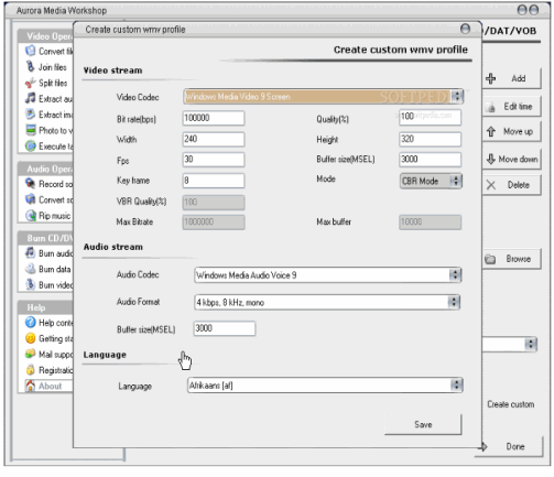 Aurora Media Workshop will also allow you to create your own wmv profile by selecting the video and audio stream options you need.